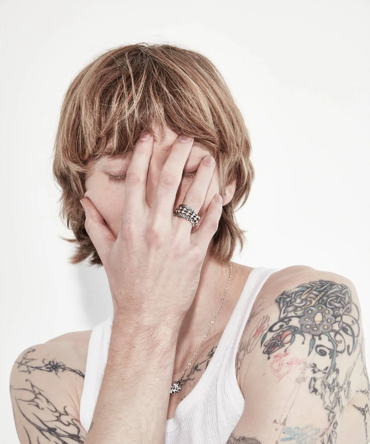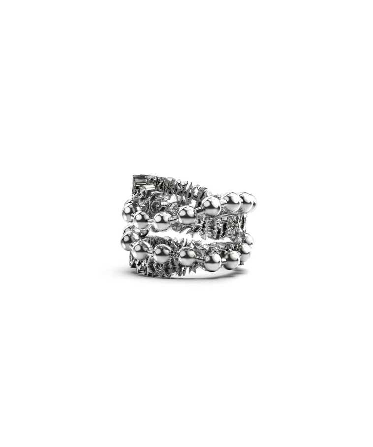 The Delicate Distortion Wrap Ring coils in polished sterling silver, layering industrial ball chain detailing against a backdrop of thorned filigree and concealed 'Stolen' logo— referenced from death metal typography.