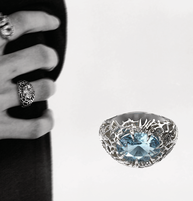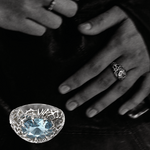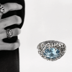 Cast in solid sterling silver, the Delicate Distortion Signet Ring centres a faceted oval-cut blue topaz, framed in a molten crown of pierced filigree.