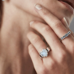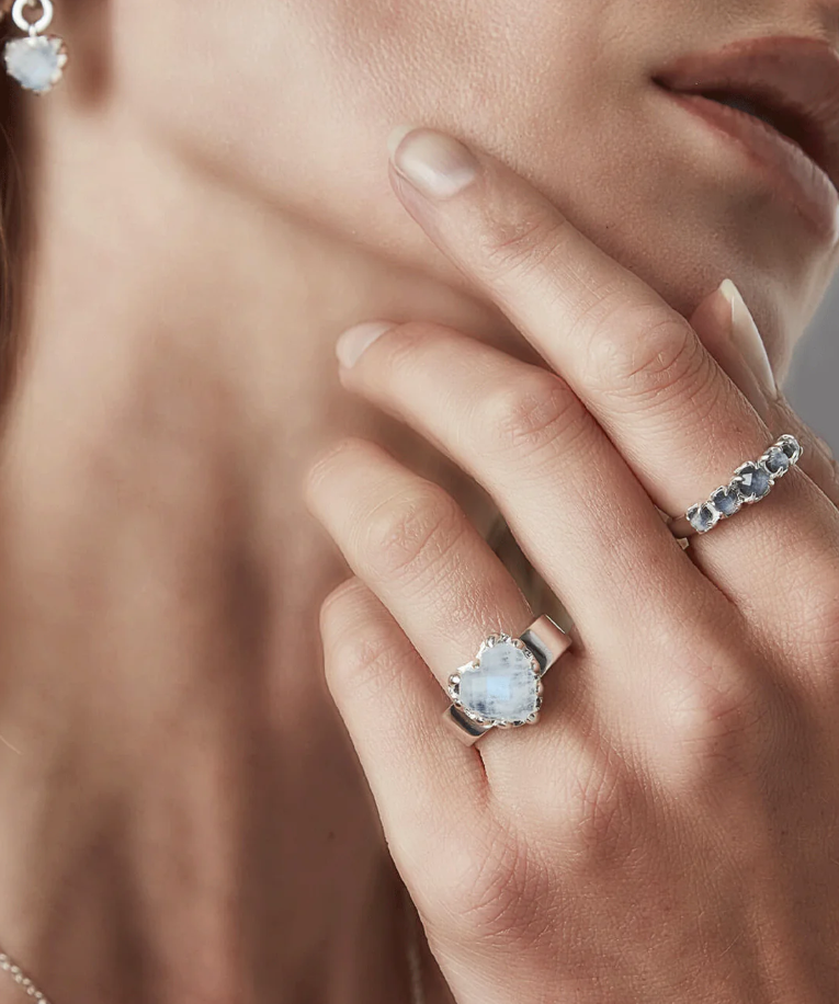 Our elegant statement ring is adorned with delicate moonstone clusters secured in a sterling silver setting.