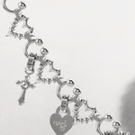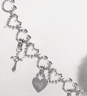 Cast in solid sterling silver, this limited-edition charm necklace features miniature bows, pierced motifs, and faceted heart stones.