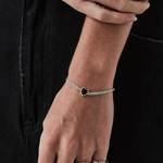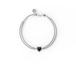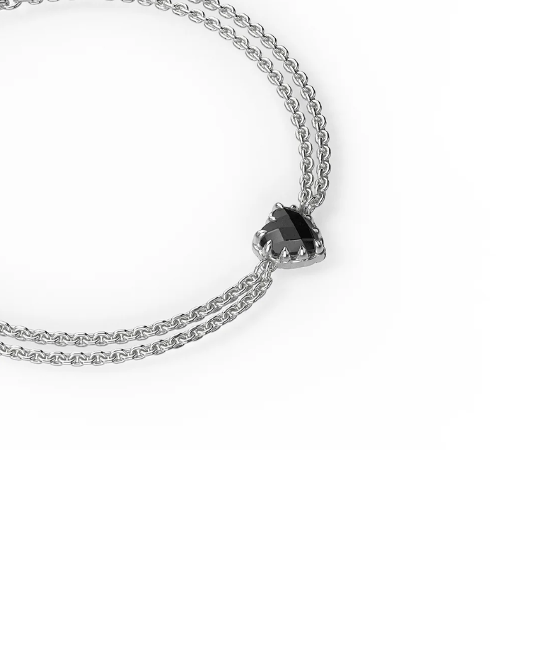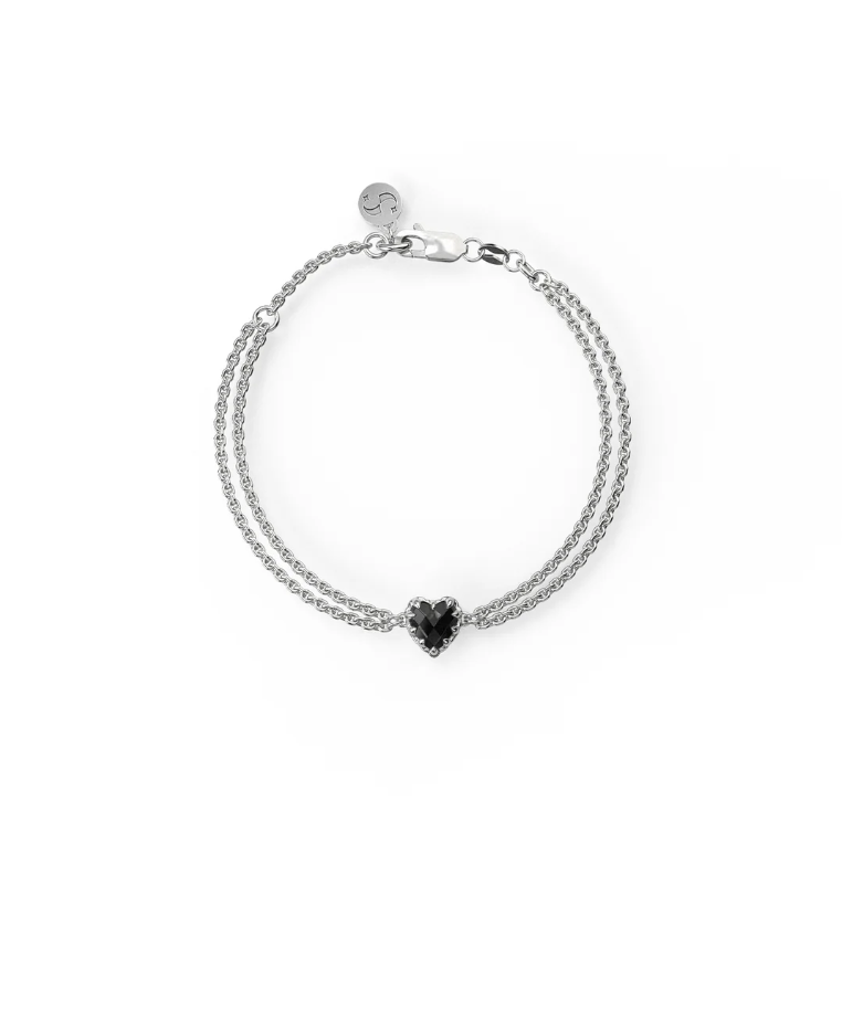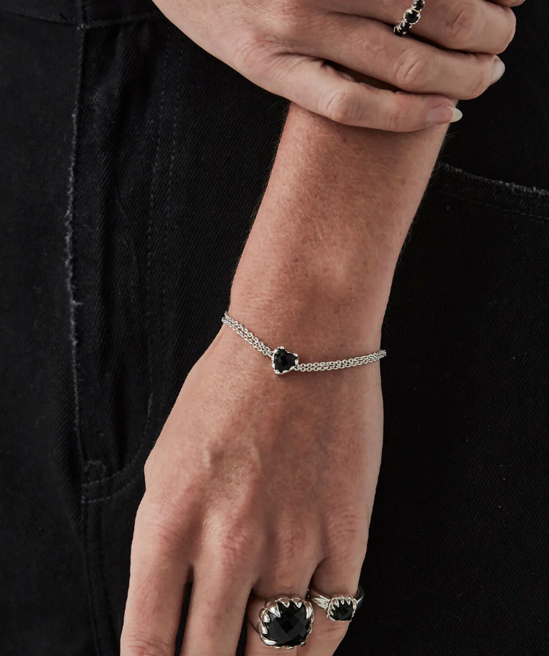 This delicate bracelet features a moody natural Onyx stone, facet-cut into a beautiful heart shape suspended between fine silver chains.
