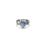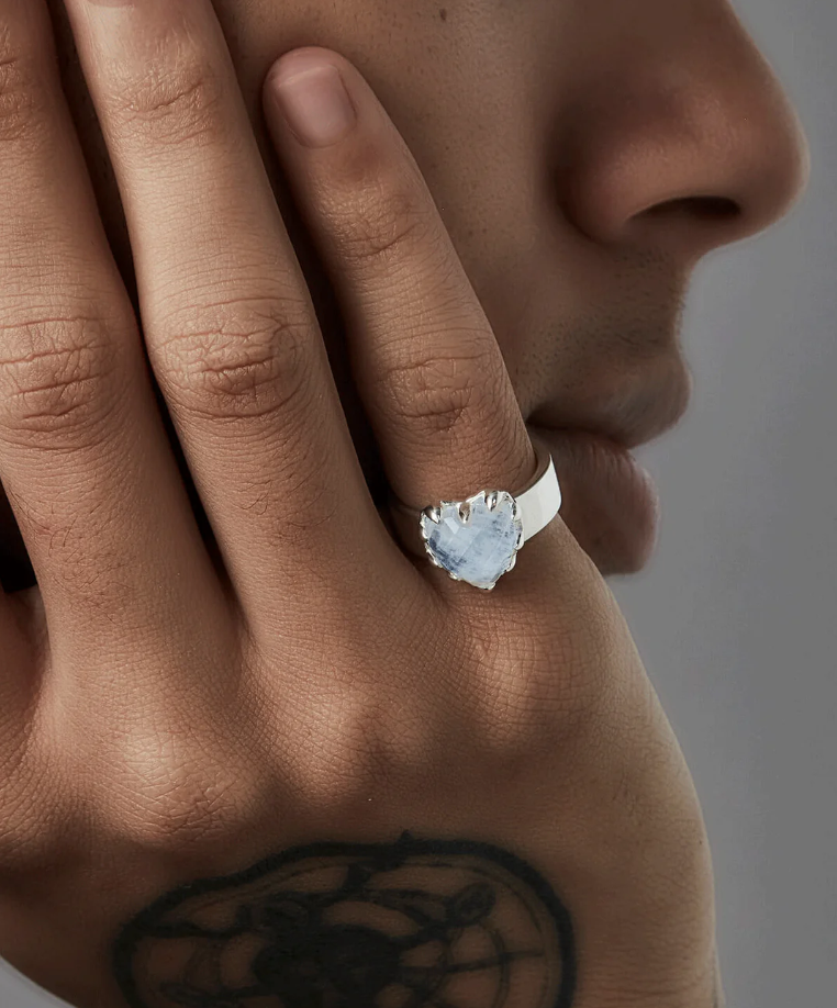 This tough-yet-beautiful ring is adorned with a large, heart-shaped natural moonstone, set in a wide solid sterling silver band.