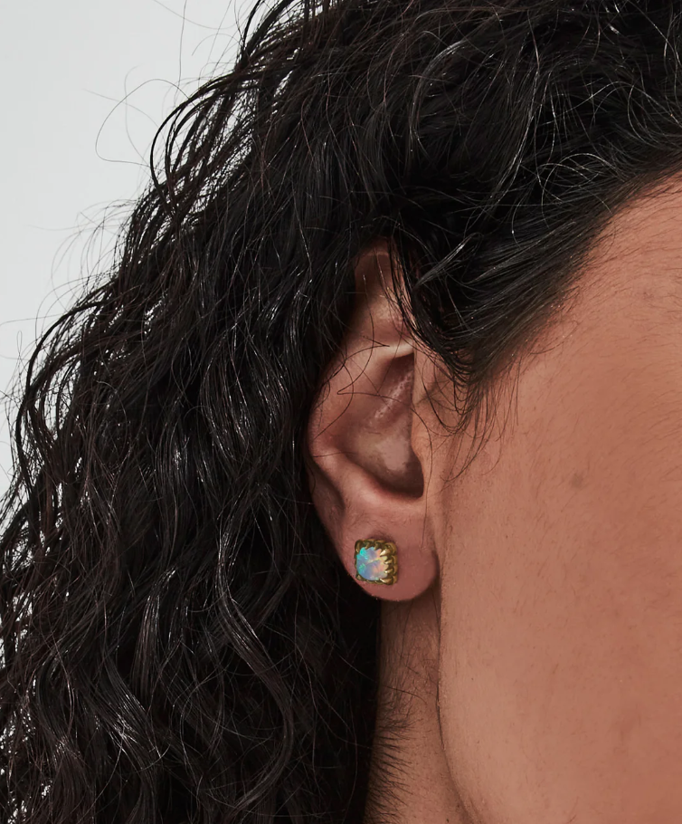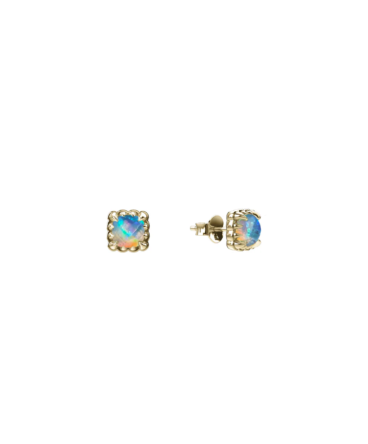 The Mini Claw Studs showcase square-cut faceted Bello Opals in SGC's signature claw setting, crafted in sterling silver with 18ct yellow gold plating.