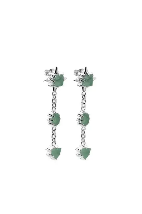 The Stolen Girlfriends Club Precious Punk Drop Earrings are crafted in solid sterling silver and feature soft green amethyst stones set in punk-inspired silver spike settings.