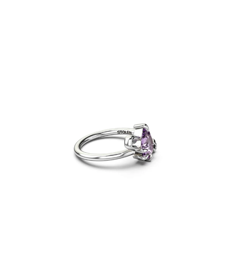 The Purity Pin Ring frames a faceted amethyst in sharp claw settings, referencing both punk hardware and aristocratic insignia.