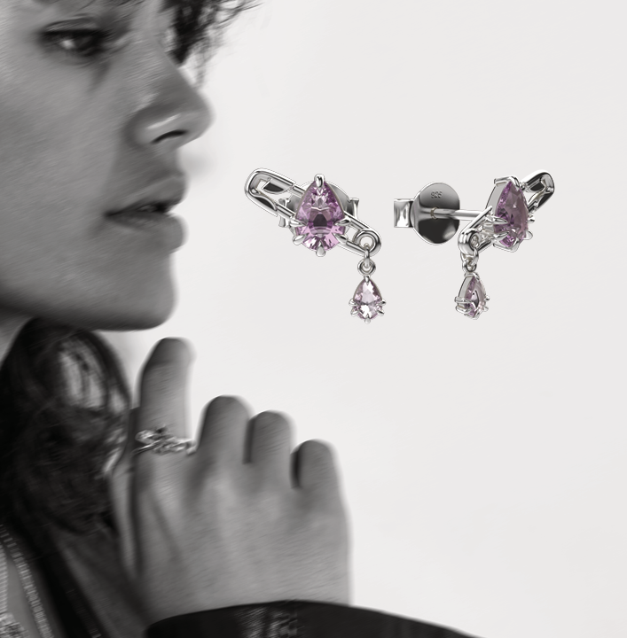 Featuring amethyst stones cut in a teardrop shape, suspended beneath safety pin-inspired forms.
