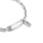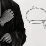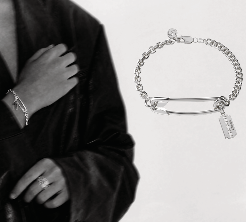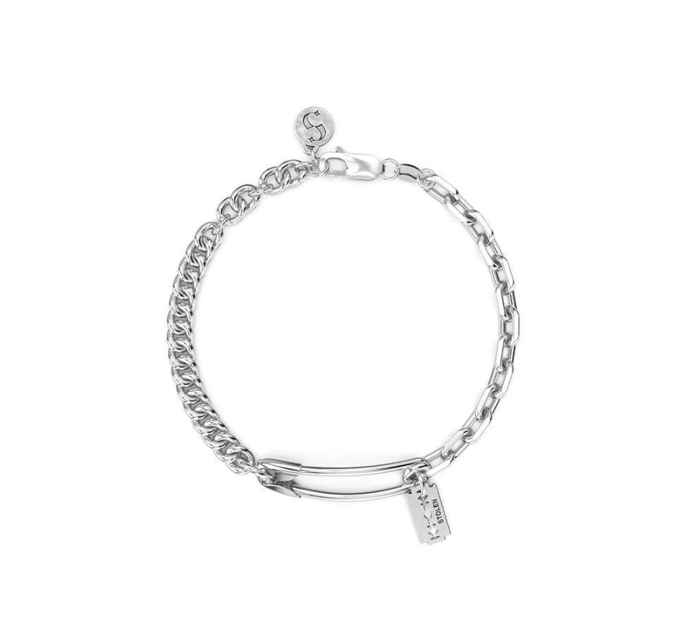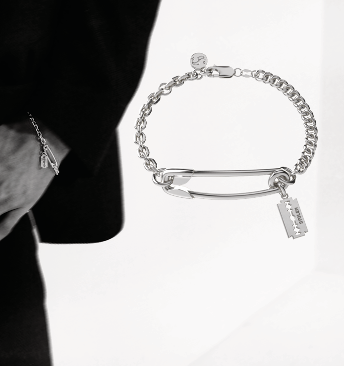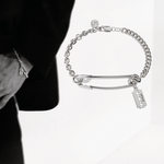 A refined interpretation of rebellion, the Razor Pin Bracelet juxtaposes delicate craftsmanship with bold symbolism. Formed in solid sterling silver, the bracelet combines custom-linked chainwork with sculptural safety pin and razor blade emblems—subtly engraved for quiet distinction.