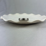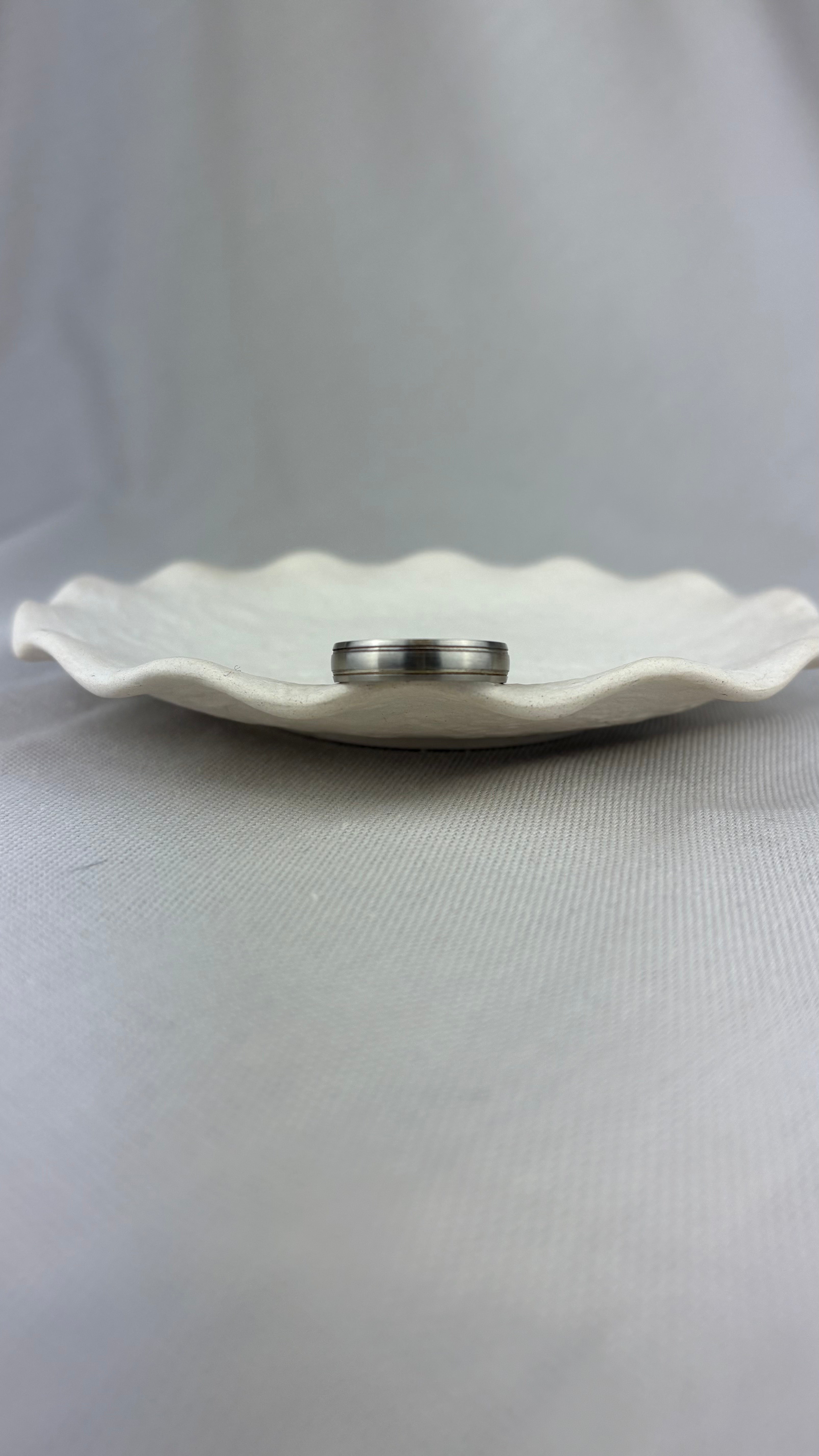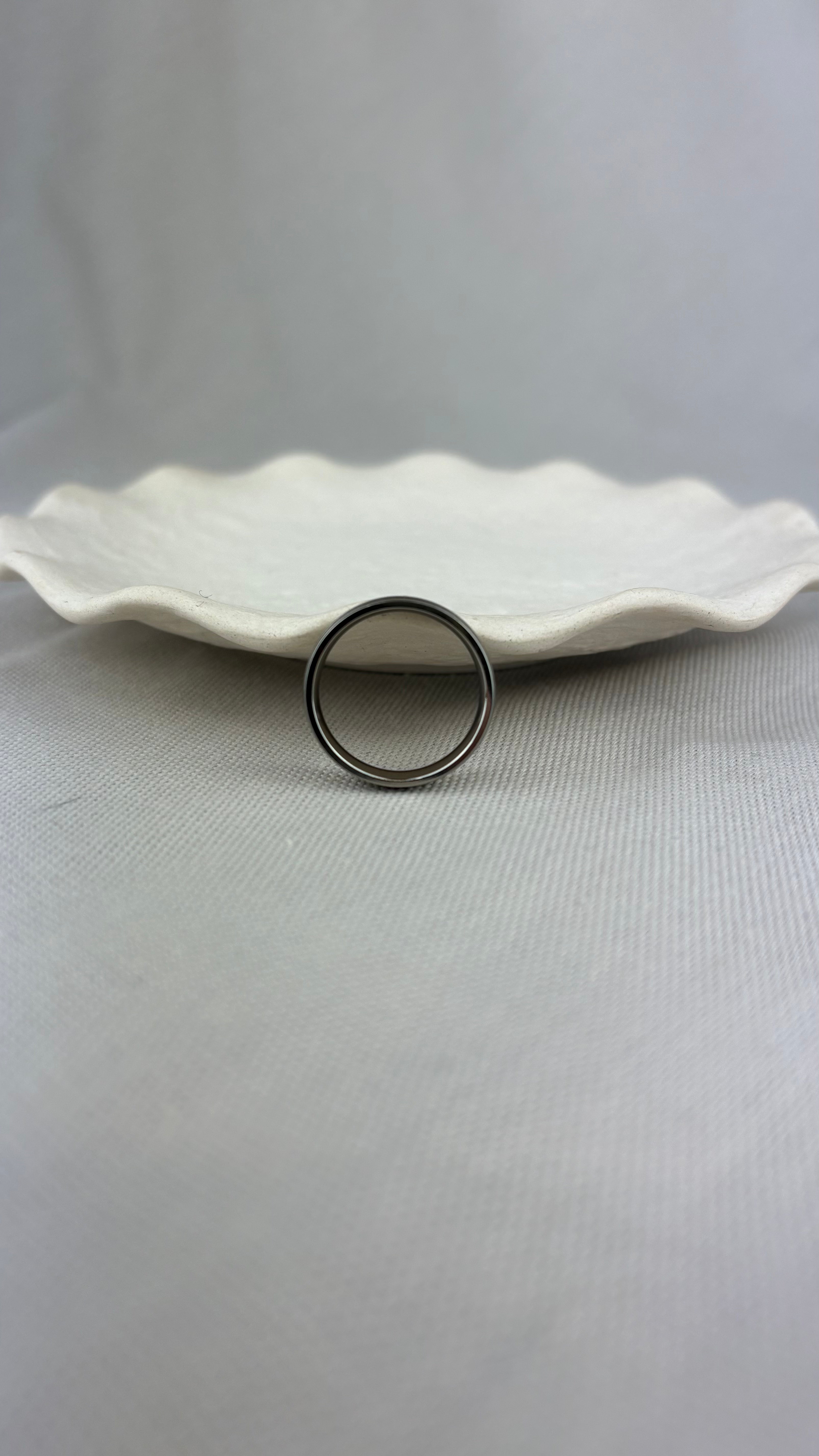 Titanium court shape profile ring, inlaid with two delicate bands of silver.