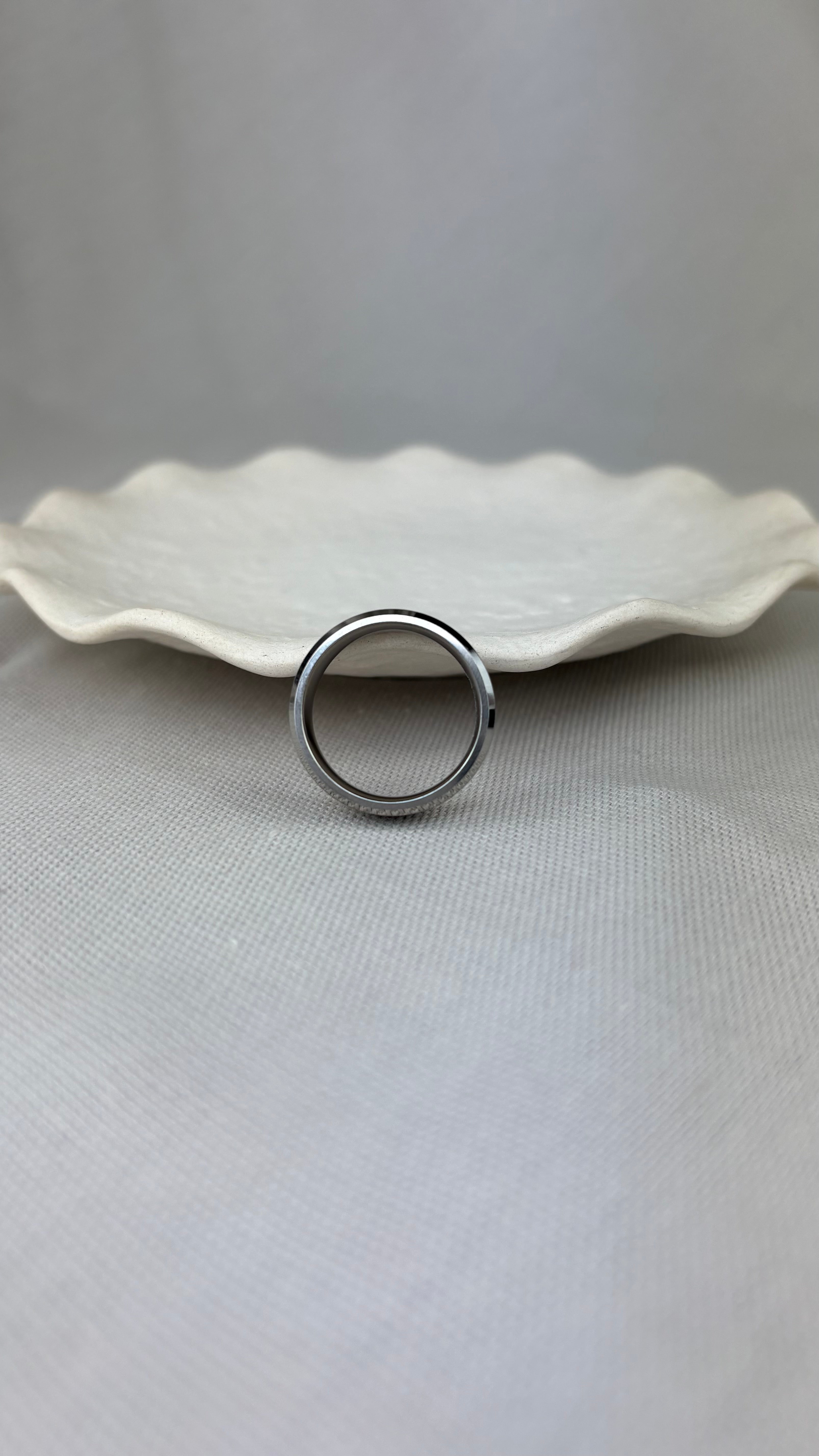 Titanium flat profile ring with bevelled edge, inlaid with two delicate bands of silver.
