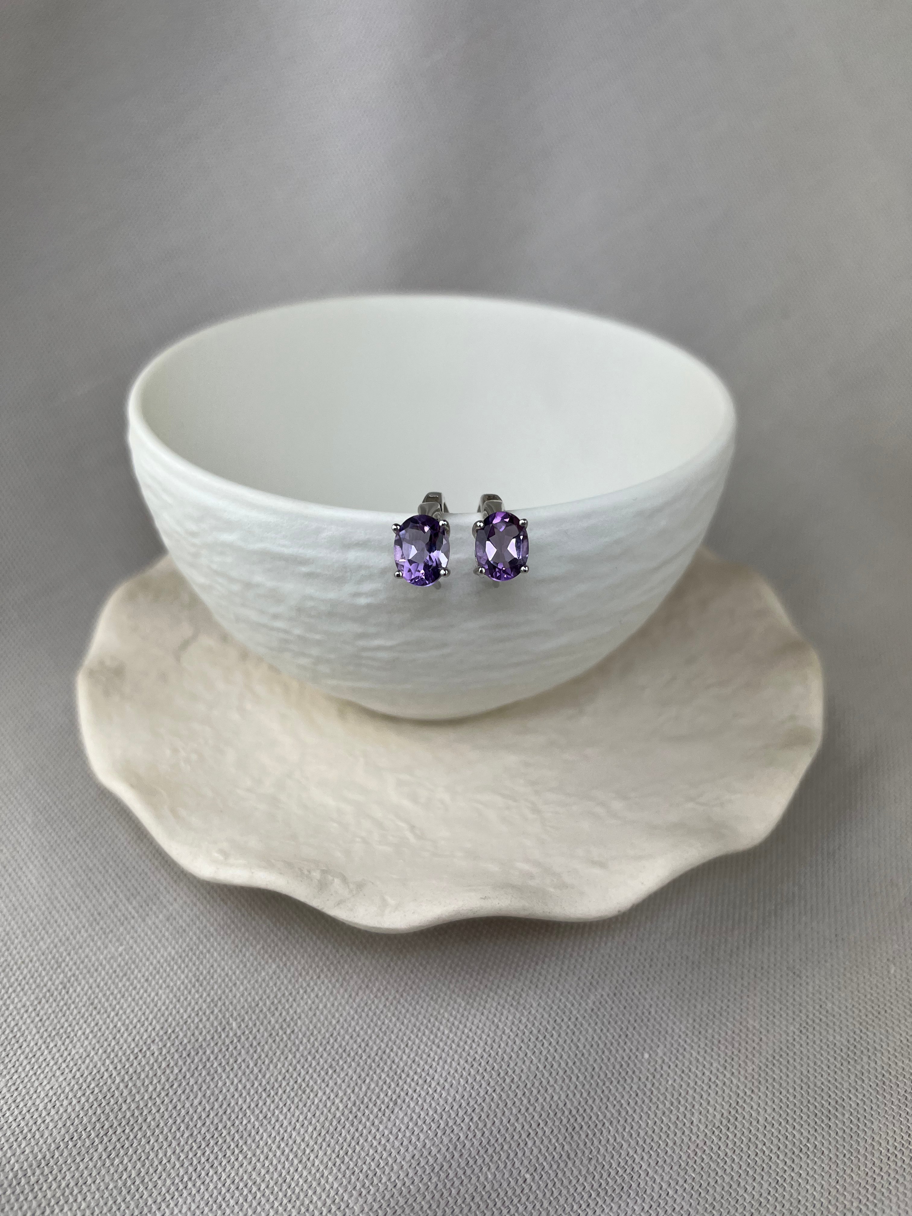 These classic oval stone earrings feature a pretty pair of faceted pale purple amethysts in four claws settings.