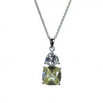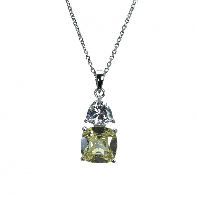 The sterling silver pendant features a canary yellow cushion shaped cubic zirconia, nestled beneath a white trillion cut cubic zirconia. The substantial size stones are mounted in beaded edge filigree settings on a plain tapered pendant loop, suspended from a sparkling faceted trace chain.