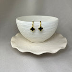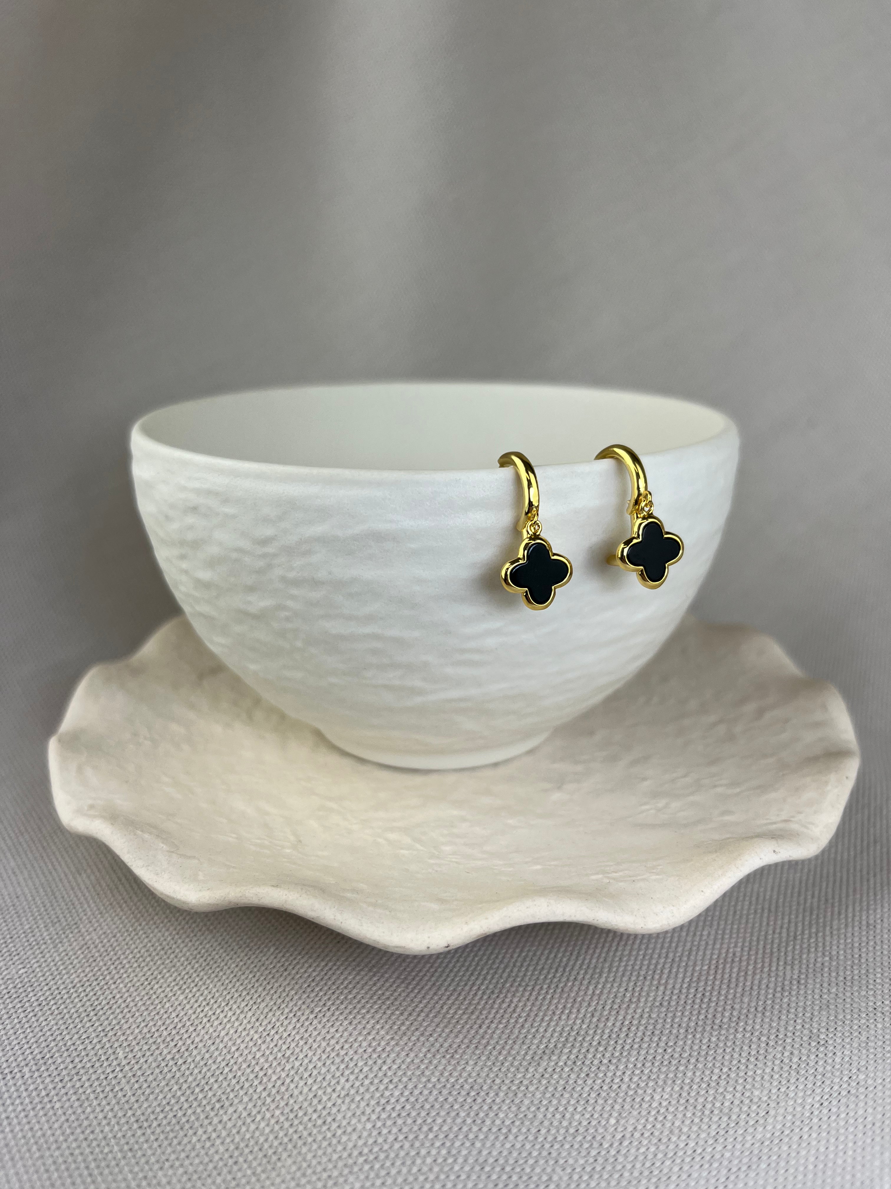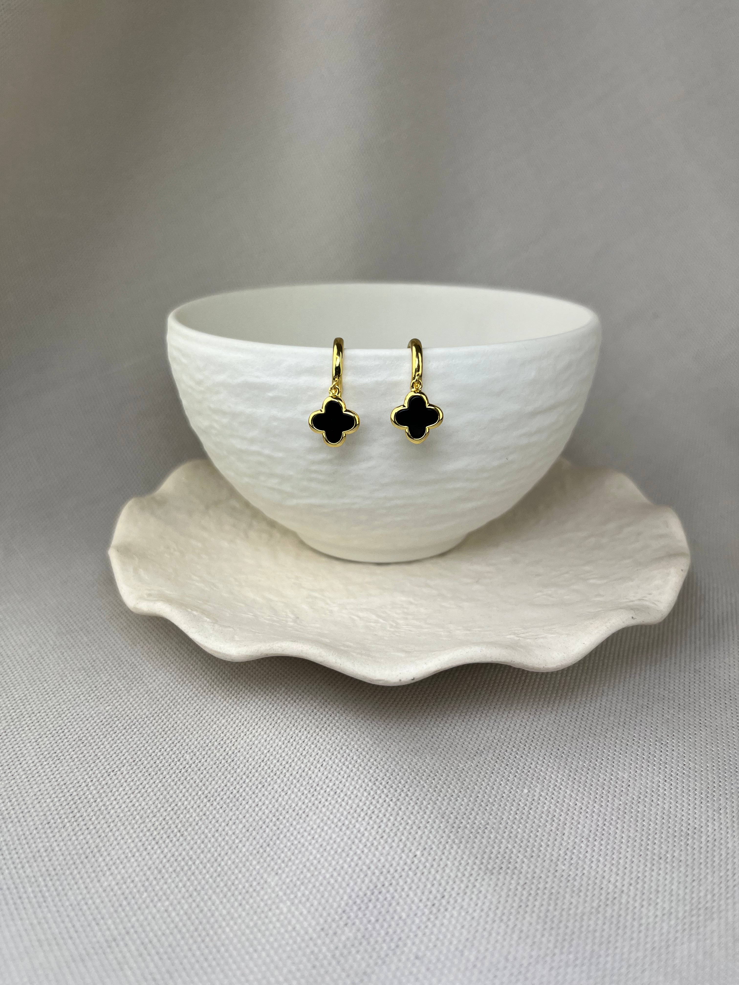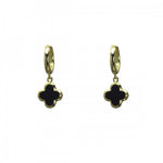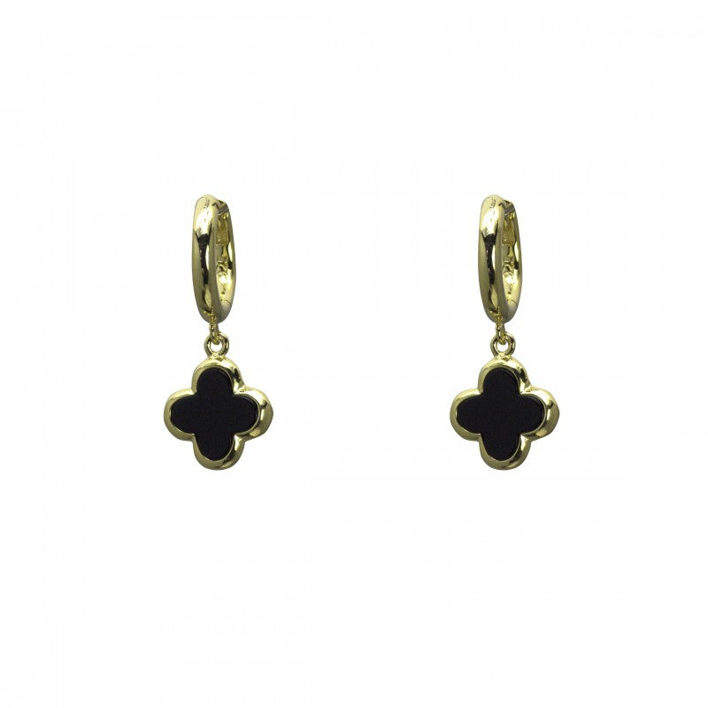 The flower drop earrings are seen here with black agate flower shaped pieces in smooth edge settings, hanging neatly from hinged hoop fittings.