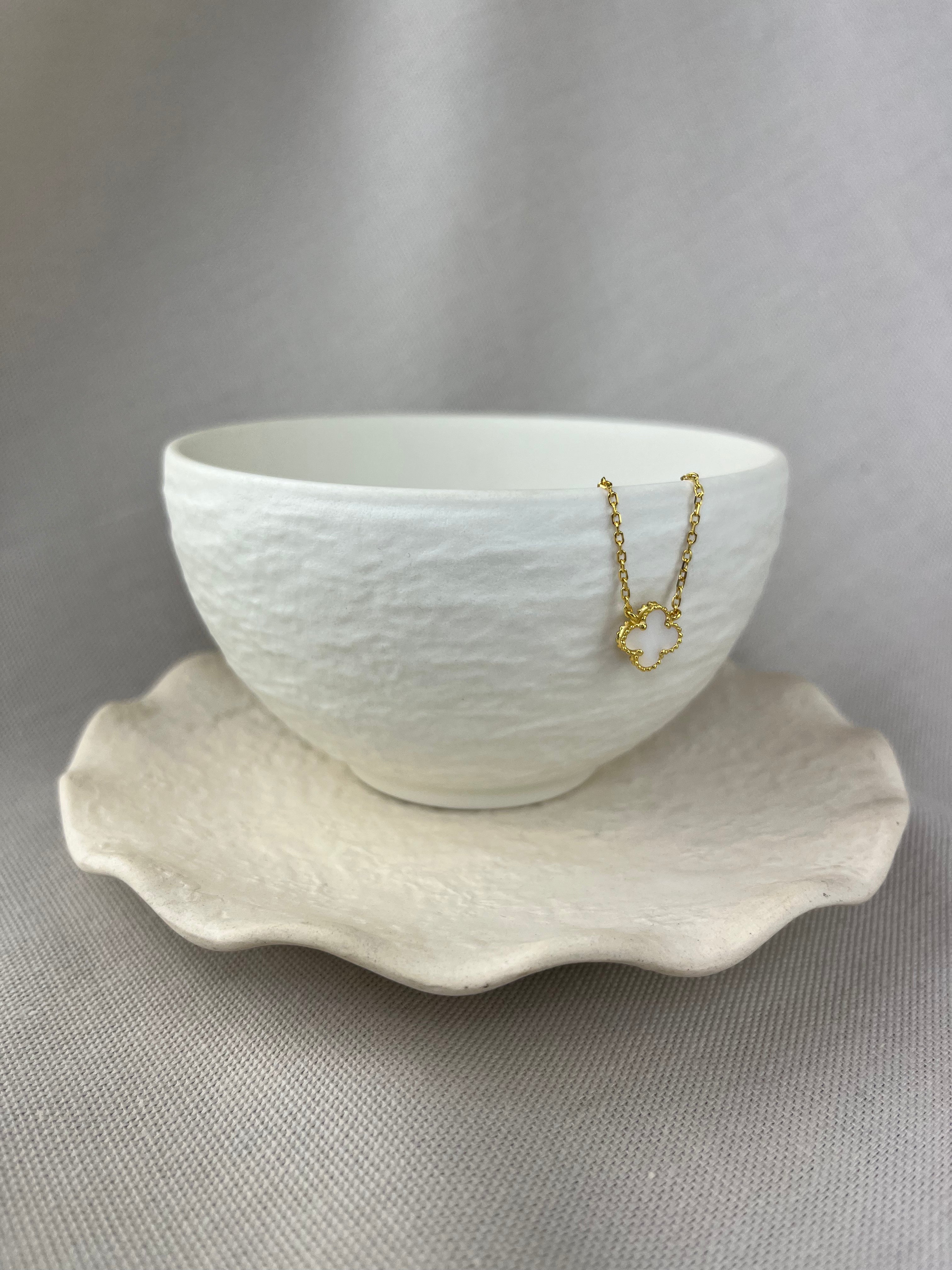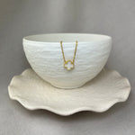The flower necklace is seen here with a single mother of pearl flower shaped piece in beaded edge setting, suspended on a square diamond belcher link necklace with carabiner fastener.