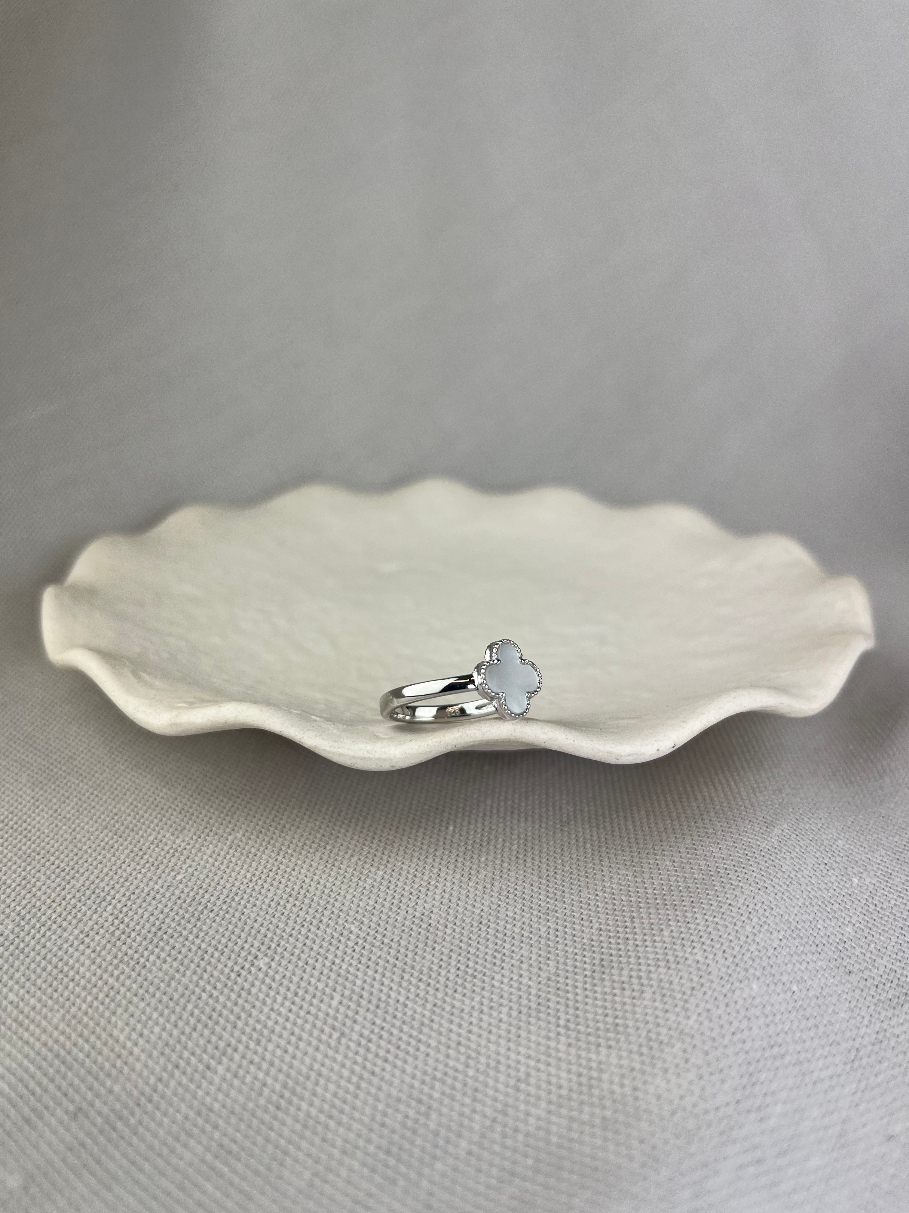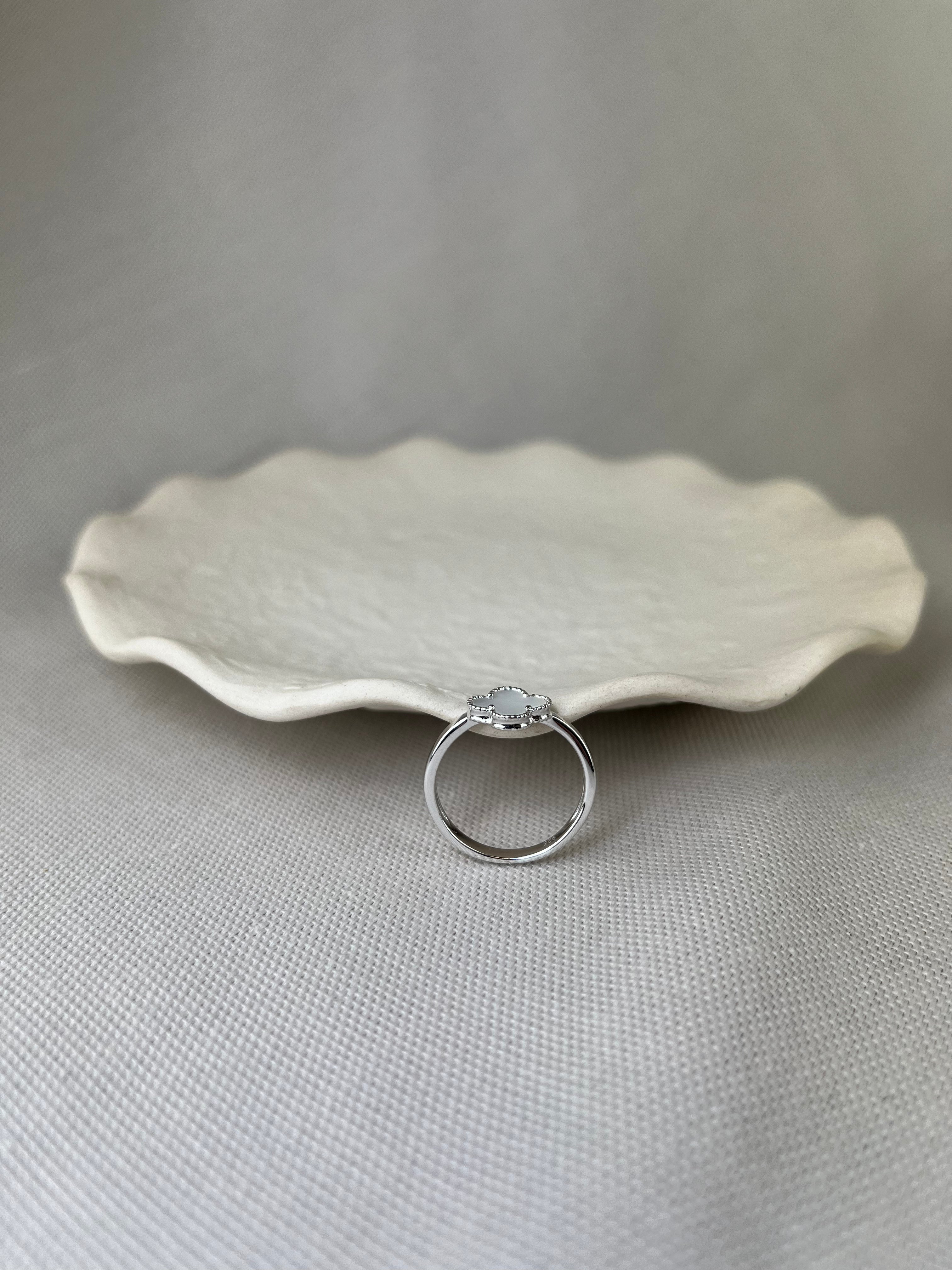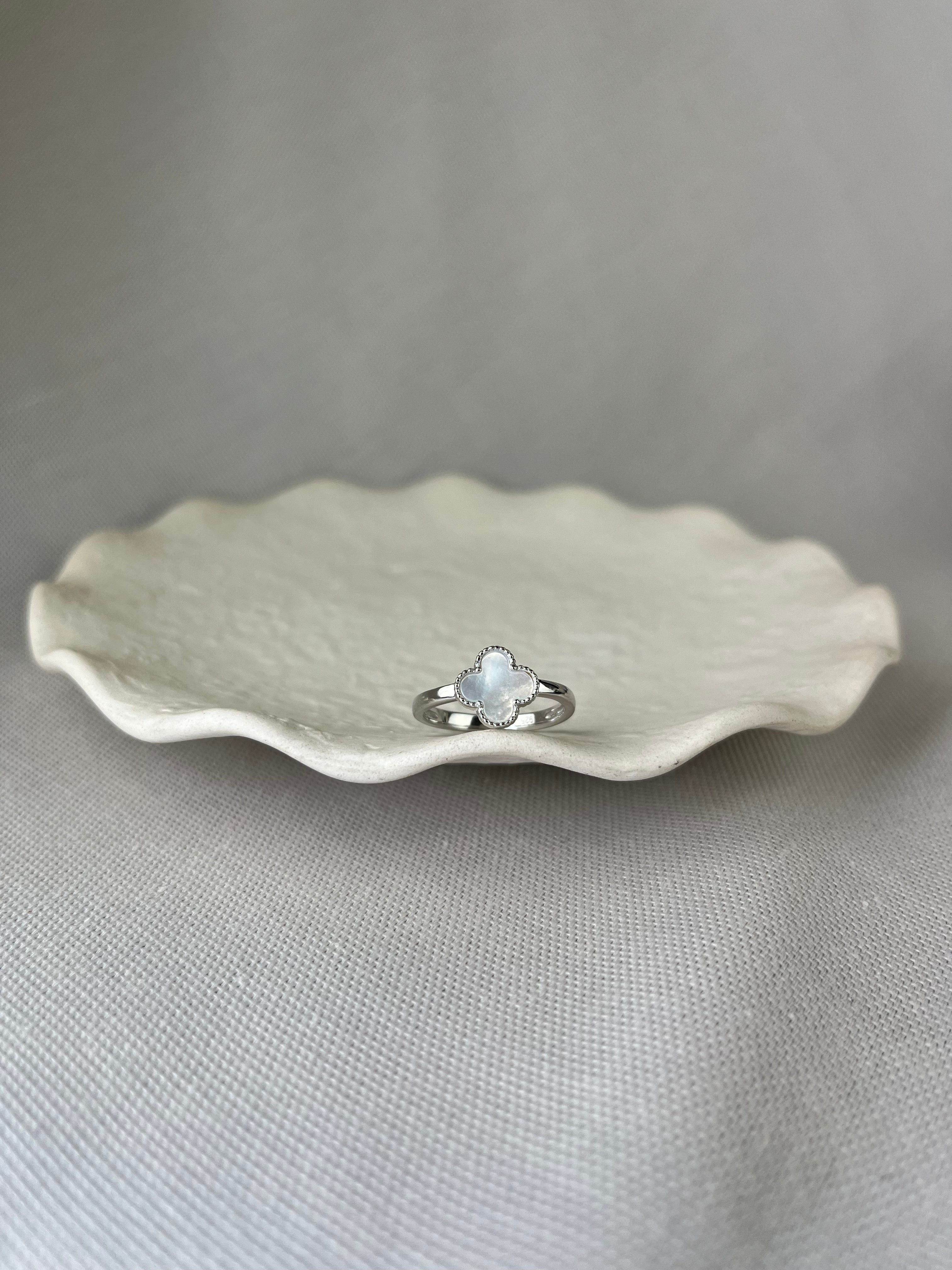 Seen here in a flower shaped mother of pearl piece in a beaded edge setting, finished with a plain polished ring shank.