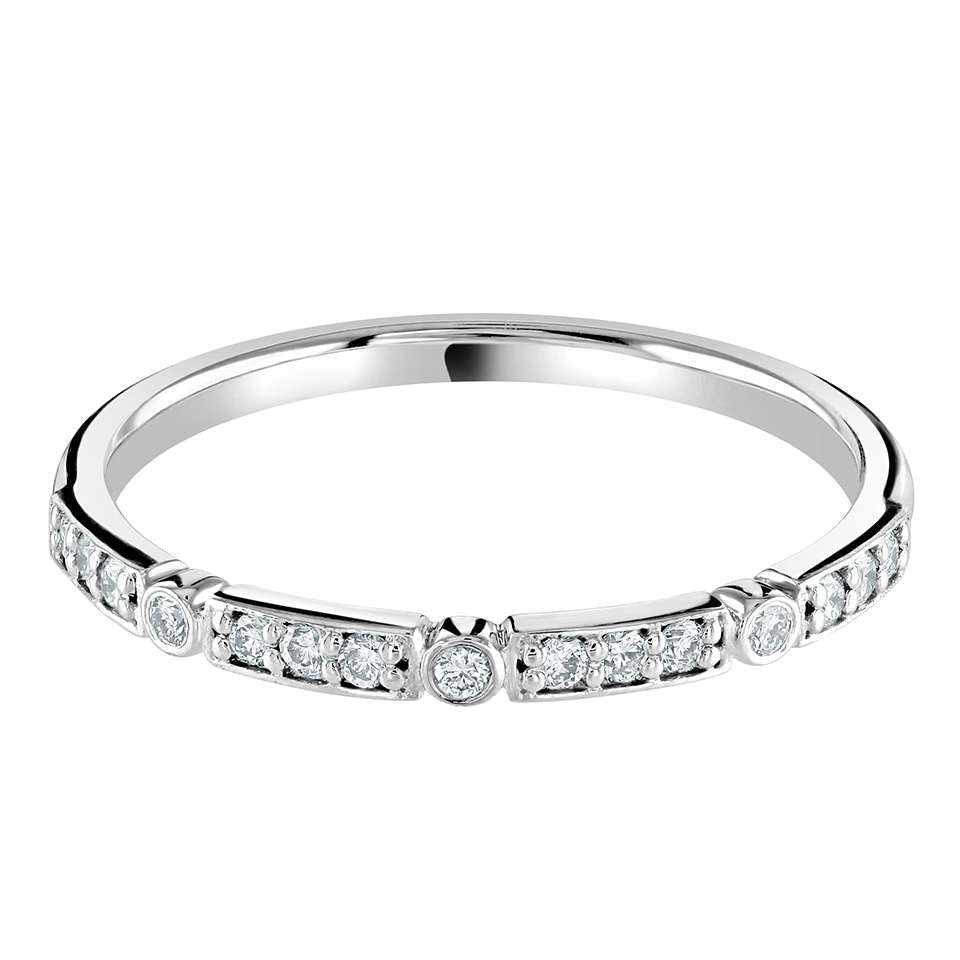 This dainty decorative diamond wedding ring showcases alternating round rubover settings and grain set diamond bars.