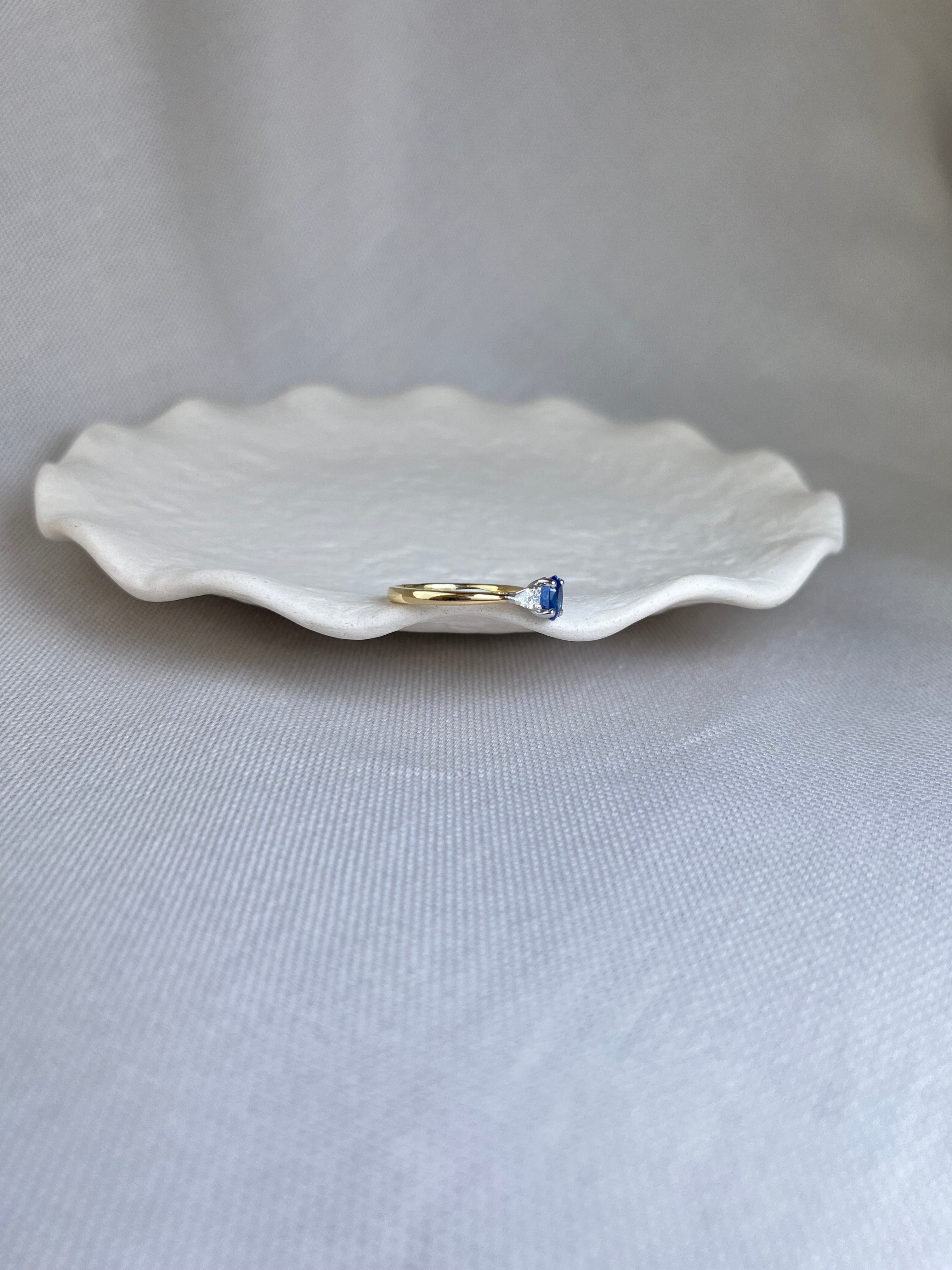 This beautiful trilogy ring perfectly showcases the bright blue colour of sapphire paired with sparking white brilliant cut diamonds.